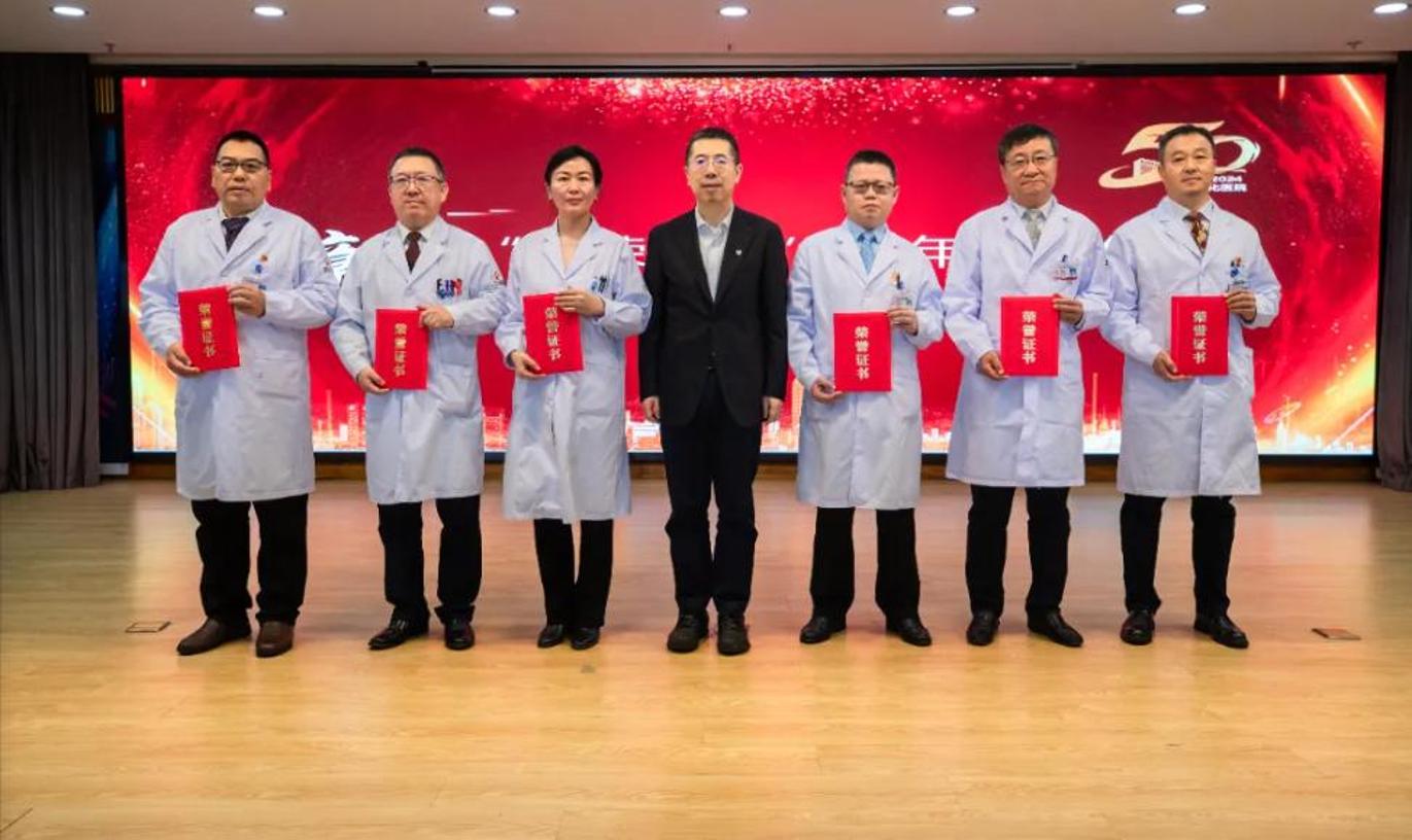宝石花医疗副总经理徐一为医院“光荣在岗30年”职工代表颁发凯发k8注册登录的荣誉证书。