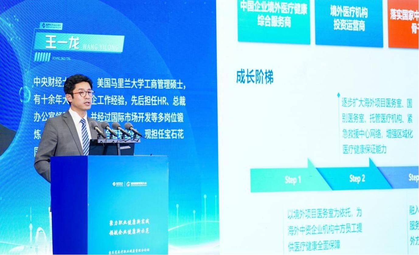 王一龙介绍了宝石花医疗作为央企医疗平台企业,在保障中国企业驻海外员工医疗健康,持续输出中国医疗技术、标准、品牌等方面的具体实践以及取得的成绩。