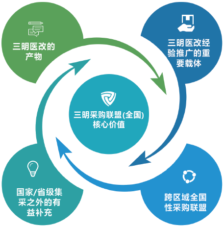 2016 年3月,药品耗材联合限价采购三明联盟(即“三明采购联盟 ( 全国 )”)正式成立。联盟以“平等自愿、互惠互利、相互补充”为原则,整合联盟资源,形成强大合力,开展以量换价、量价挂钩,挤压药品耗材虚高“水分”,规范药品耗材采购与使用行为,引导药耗价格回归合理水平,通过堵浪费、腾空间、调结构,推动“腾笼换鸟”,促进联盟成员地区医疗、医保、医药“三医协同”发展和治理,提升医疗卫生服务效能。经过近年来的不断探索发展,三明采购联盟(全国)已经形成了较完整的药品、耗材采购目录。