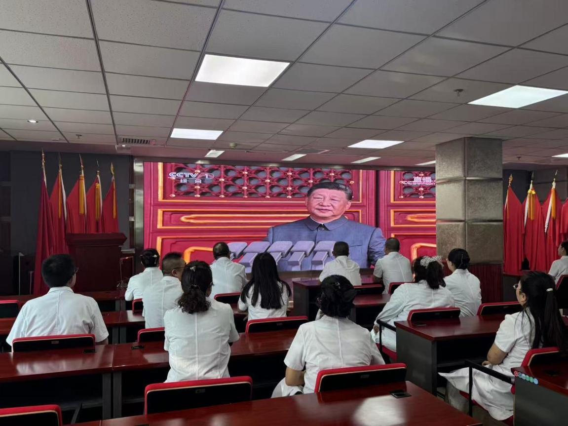 公司总部及多家医院设置了集中观看会场,党员干部带头参与,职工群众踊跃参加。大家神情庄重,全程认真聆听习近平总书记重要讲话,深刻体会中国人民在抗日战争中展现出的不屈不挠、英勇顽强的民族精神,现场氛围严肃而热烈。